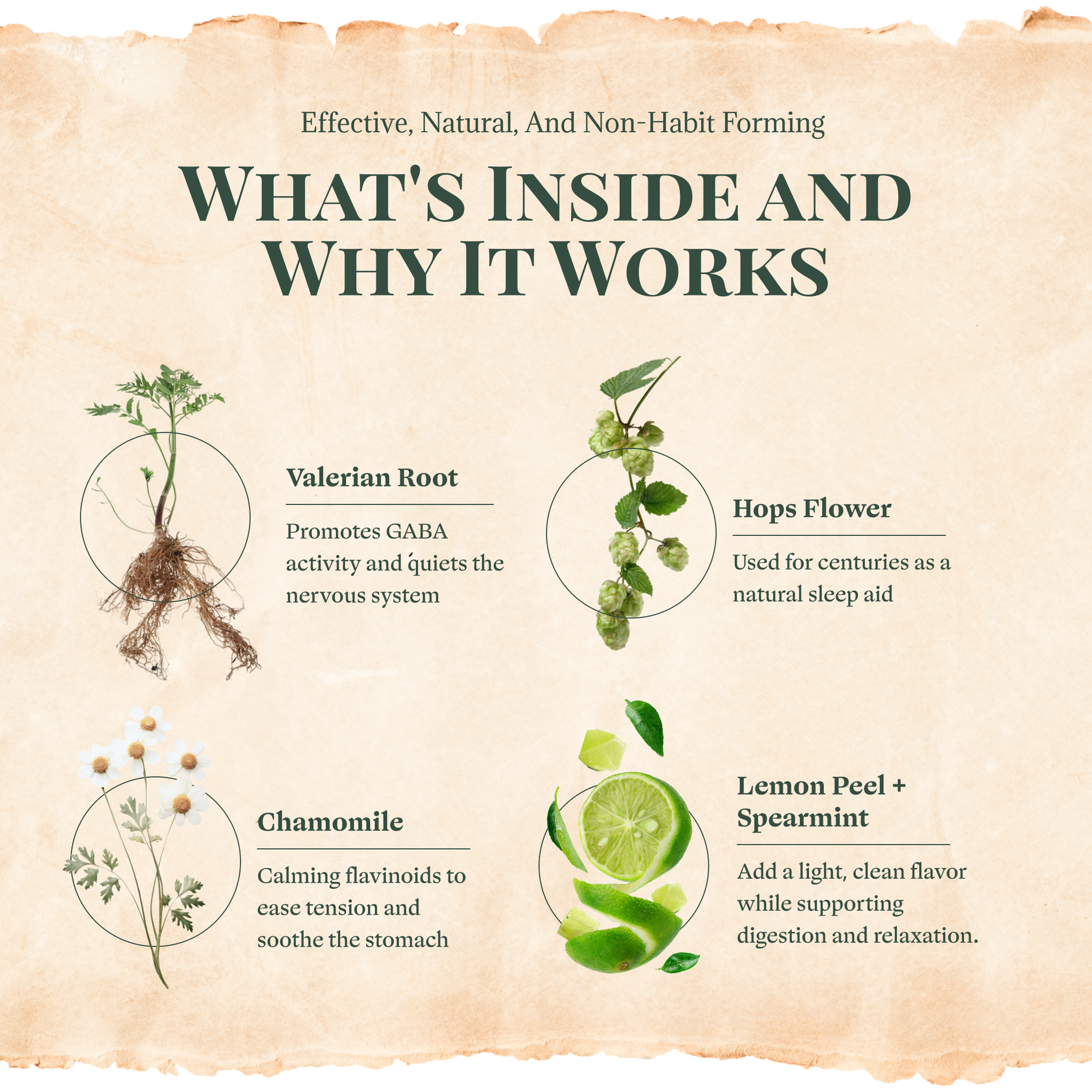 Every ingredient is carefully chosen to quiet the mind and support deep, natural rest.
